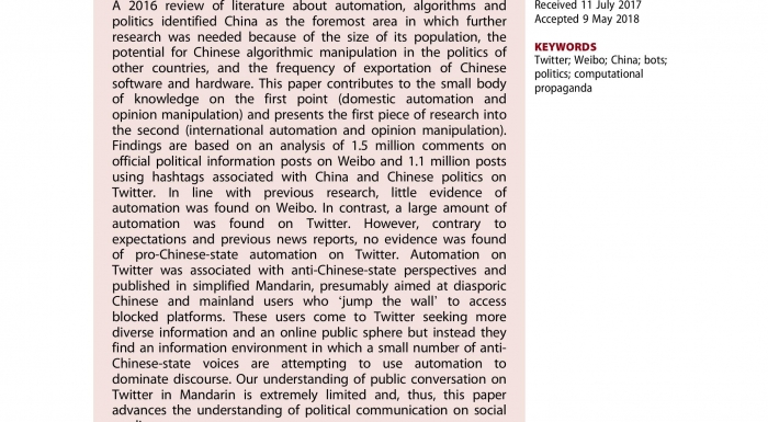 A 2016 review of literature about automation, algorithms and politics identified China as the foremost area in which further research was needed because of the size of its population, the potential for Chinese algorithmic manipulation in the politics of other countries, and the frequency of exportation of Chinese software and hardware. This paper contributes to the small body of knowledge on the first point (domestic automation and opinion manipulation) and presents the first piece of research into the second (international automation and opinion manipulation). Findings are based on an analysis of 1.5 million comments on official political information posts on Weibo and 1.1 million posts using hashtags associated with China and Chinese politics on Twitter. In line with previous research, little evidence of automation was found on Weibo. In contrast, a large amount of automation was found on Twitter. However, contrary to expectations and previous news reports, no evidence was found of pro-Chinese-state automation on Twitter. Automation on Twitter was associated with anti-Chinese-state perspectives and published in simplified Mandarin, presumably aimed at diasporic Chinese and mainland users who ‘jump the wall’ to access blocked platforms. These users come to Twitter seeking more diverse information and an online public sphere but instead they find an information environment in which a small number of anti-Chinese-state voices are attempting to use automation to dominate discourse. Our understanding of public conversation on Twitter in Mandarin is extremely limited and, thus, this paper advances the understanding of political communication on social media.