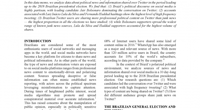 Caio Machado, Beatriz Kira, Gustavo Hirsch, Nahema Marchal, Bence Kollanyi, Philip N. Howard, Thomas Lederer, and Vlad Barash. “News and Political Information Consumption in Brazil: Mapping the First Round of the 2018 Brazilian Presidential Election on Twitter.” Data Memo 2018.4. Oxford, UK: Project on Computational Propaganda. comprop.oii.ox.ac.uk